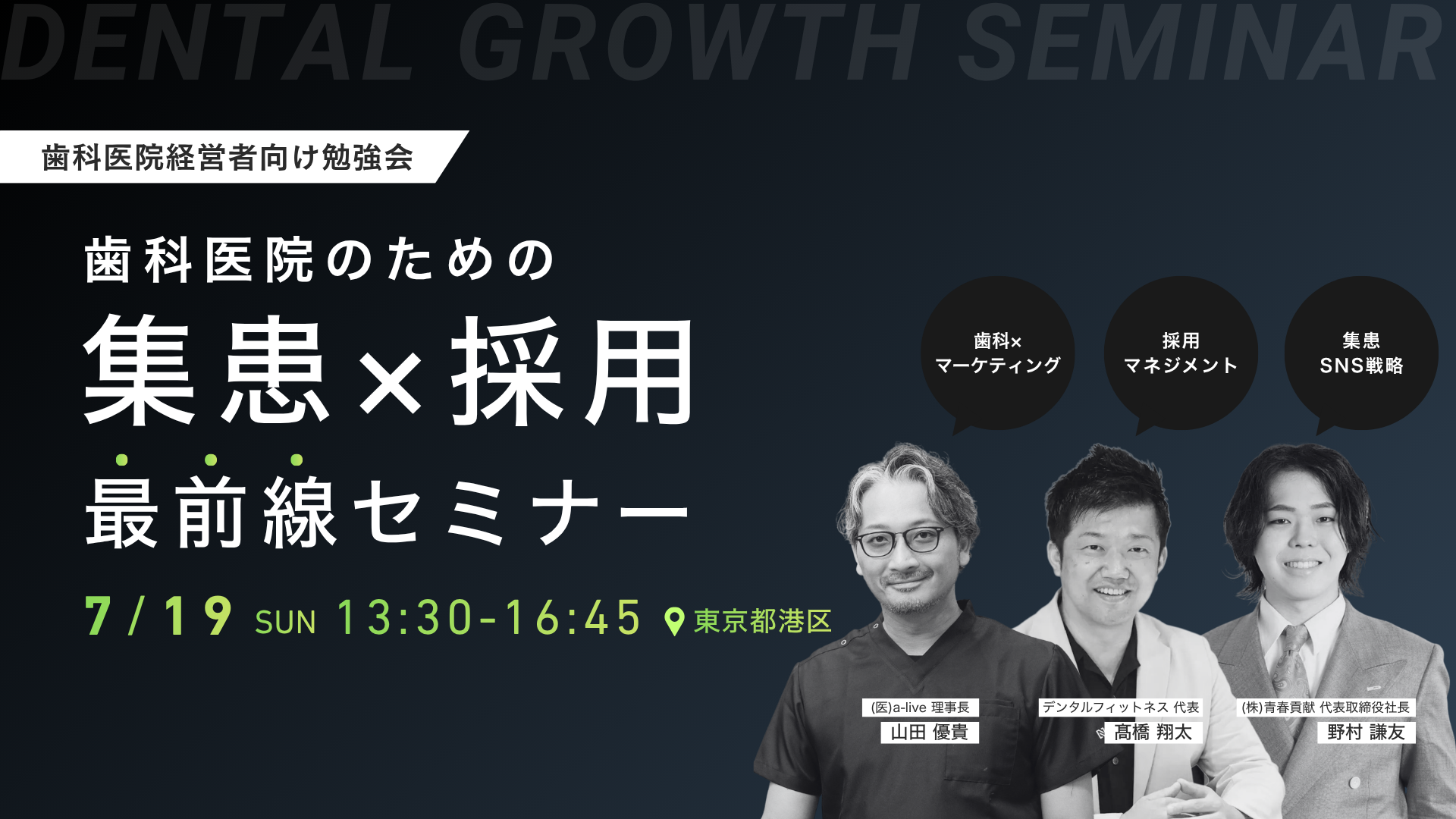 借入ができない中、父の歯科医院継承をし、投資ゼロから1年で業績200%達成。その8ヶ月後にはユニット3台で年商1億円を突破。現在はユニット10台まで増設し、年商も毎年130%〜150%超えを続けている。2022年は継承後業績500%、業界TOP3%となる年商2億円を達成。2024年3億円を突破。同年、分院を展開し、患者様に上質な医療を提供し続けている。採用は、継承後5年間の中で社員数3名→34名。試行錯誤しながら培ってきたリアルな戦略を解説。